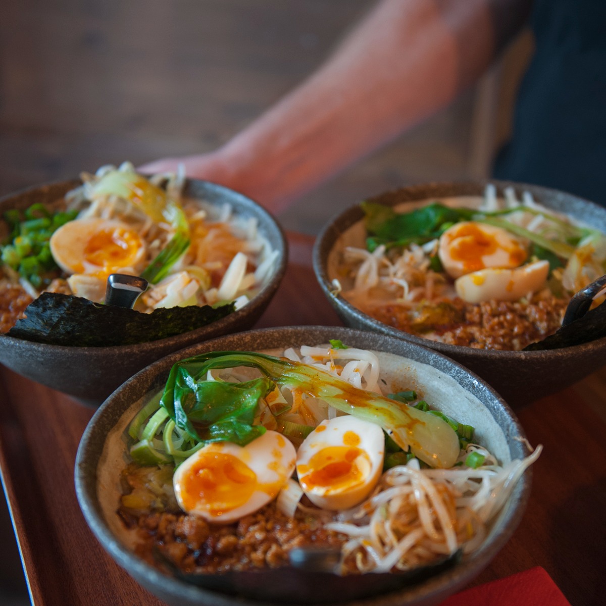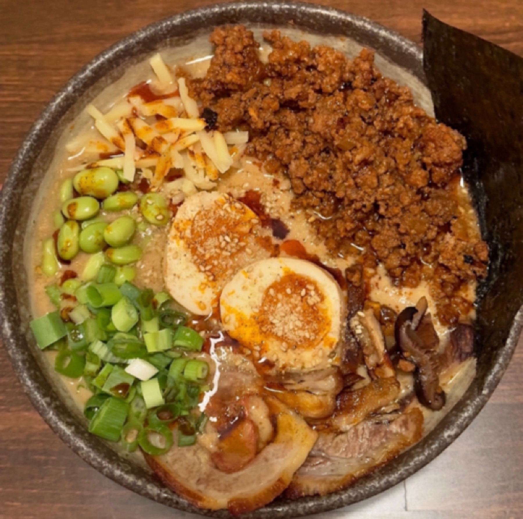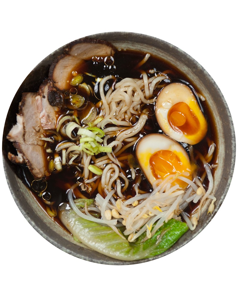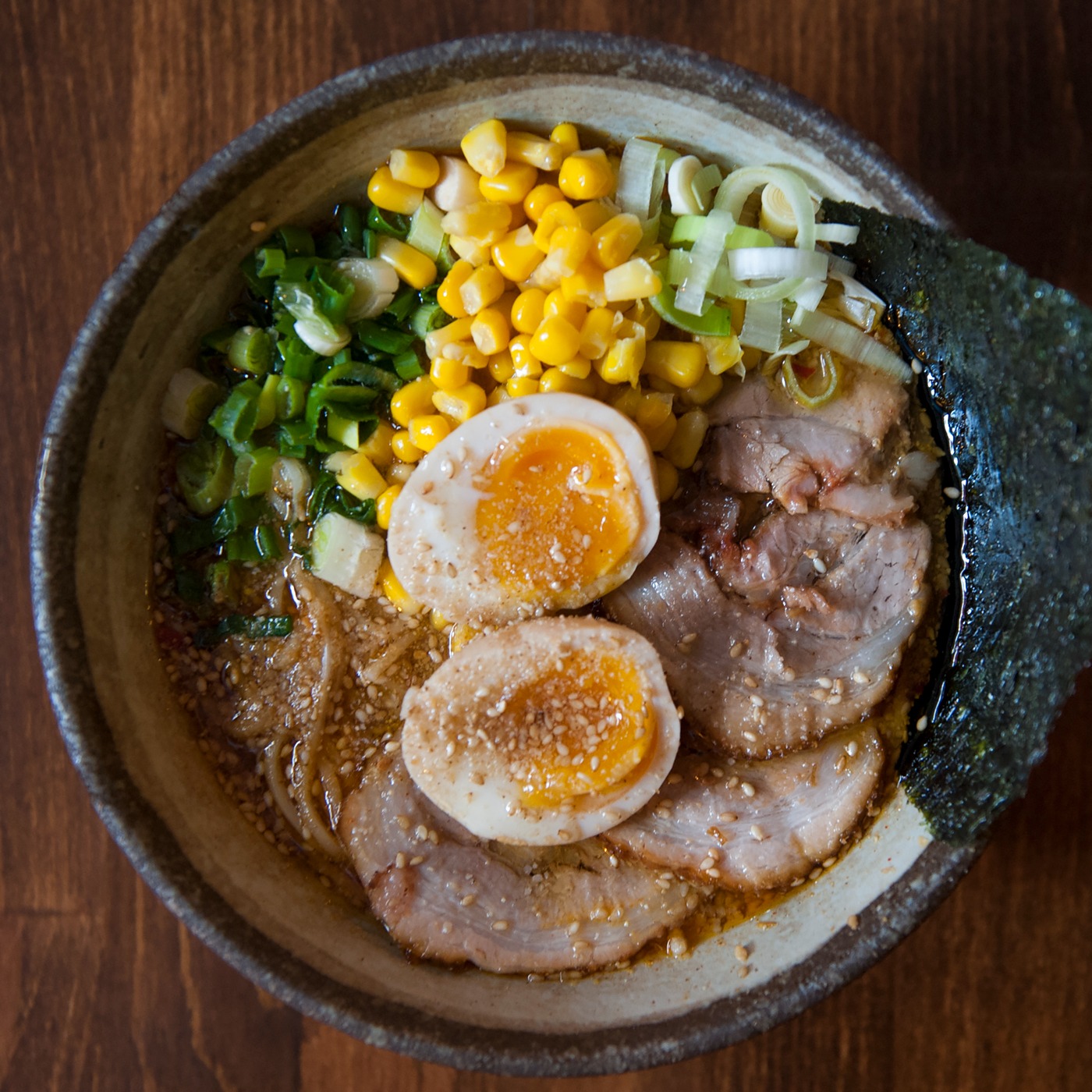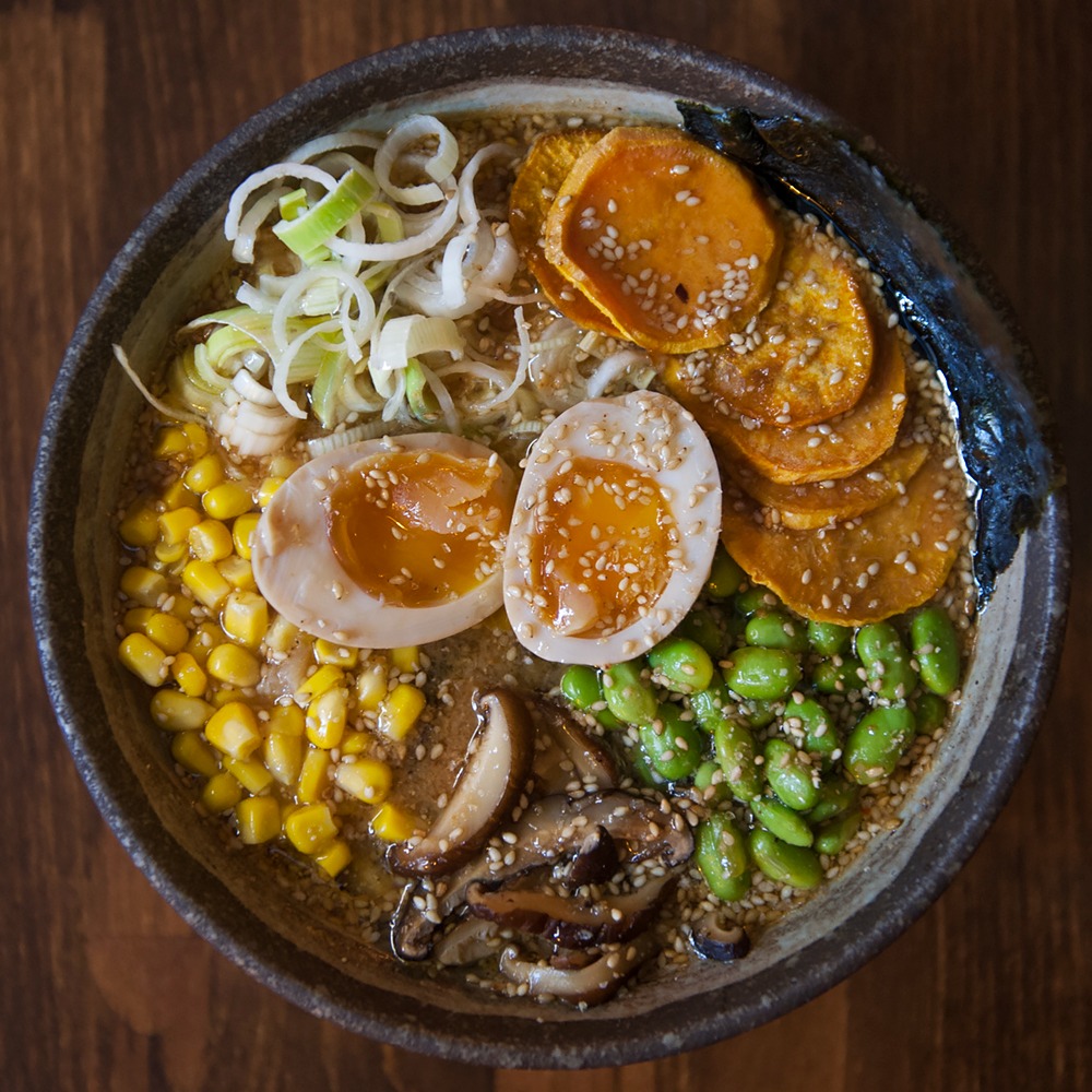 - ręcznie robiony makaron, bataty, nitamago, chili, kiełki fasoli mung, pok choy, soja edamam, kukurydza zielona dymka i nori